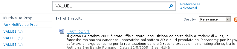 Side Note: I used a custom crawler in this example. If you use a Document Library you will see slightly different results. FAST will act the same with the exception that the 1st Value appears on the first test instead of the last value. In SharePoint, all the properties will appear in either scenario but both will appear as "VALUE1;VALUE2;VALUE3" when attempting to use the Managed Property as a refiner.
